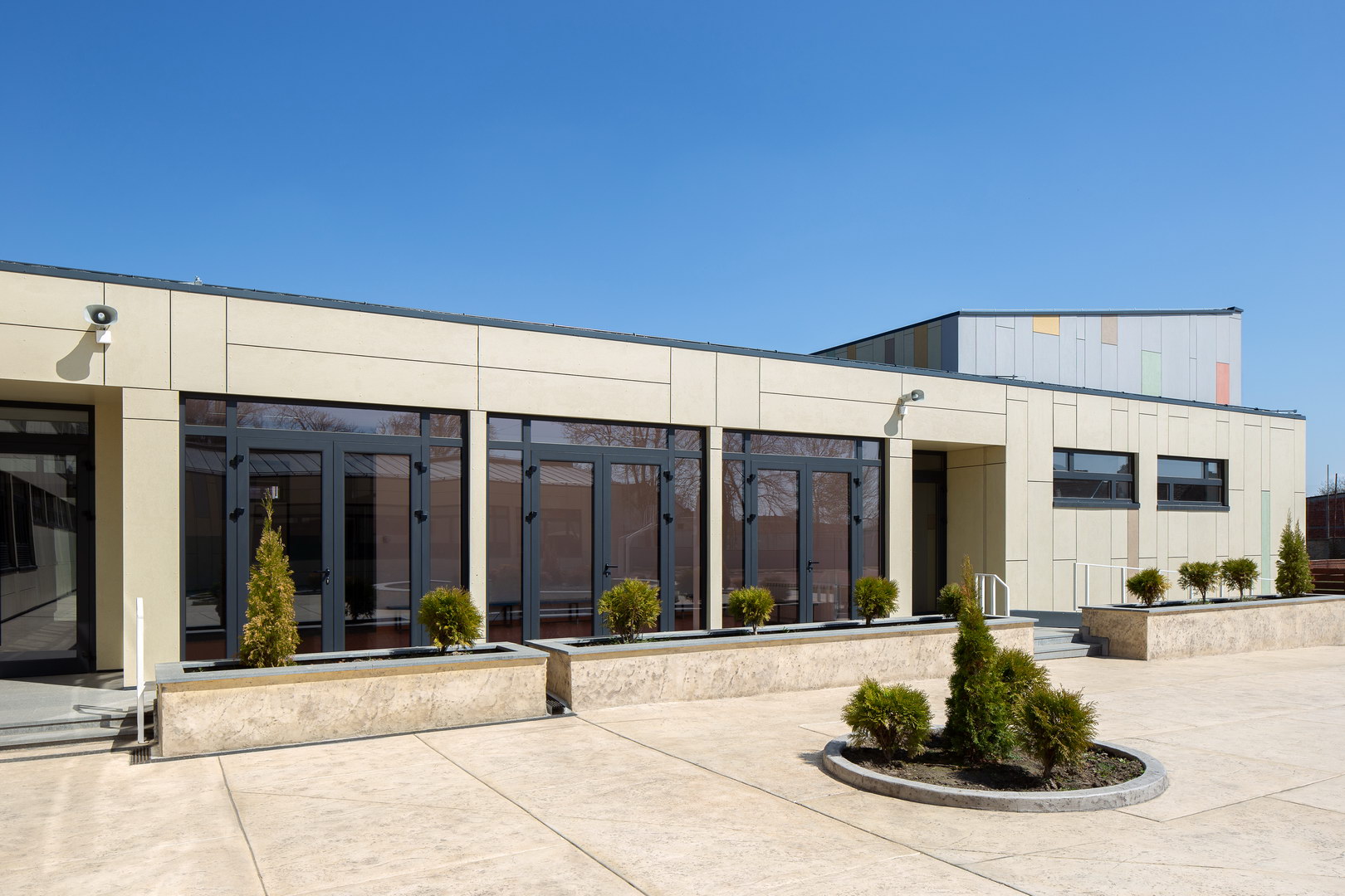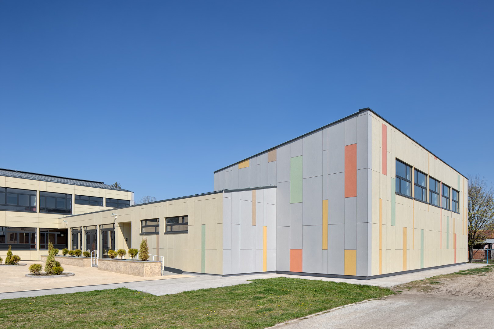 Far away of city hectic, in rural area, dilapidated school was refurbished, new gym was built and happy, colourful facade was chosen to welcome pupils every day.