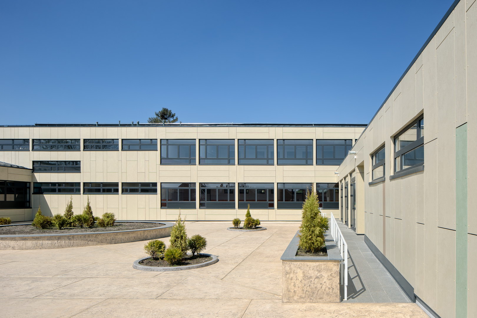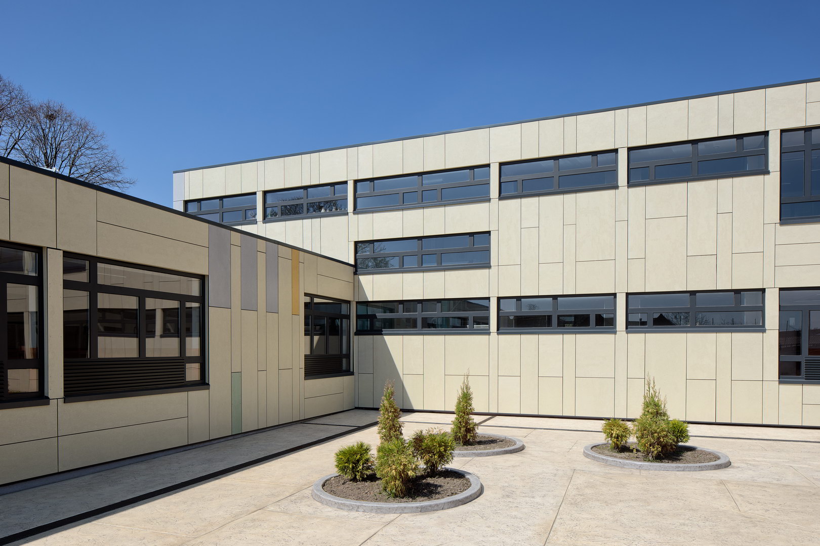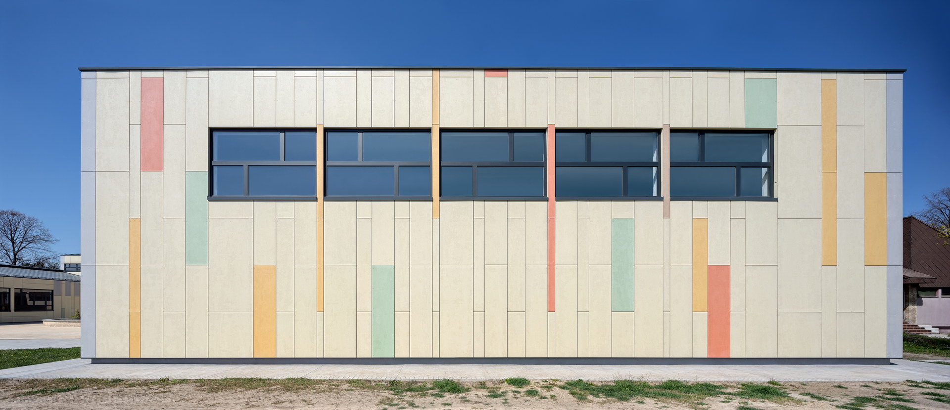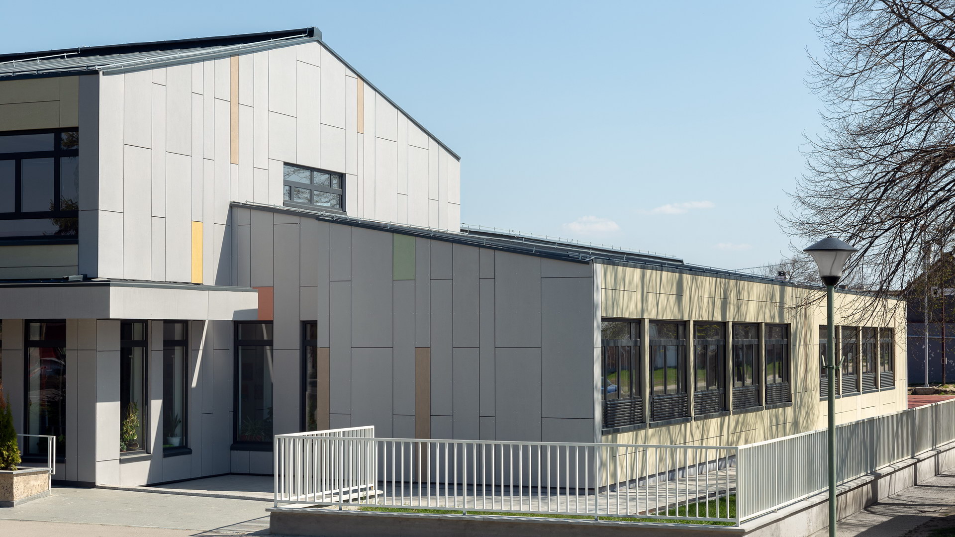 Fibercement panels Silbonit, series Hydro, colours Naturale, Pergamena, Rosso, Grigio, Giallo, Verde and Deserto, are used as ventilated facade cladding.