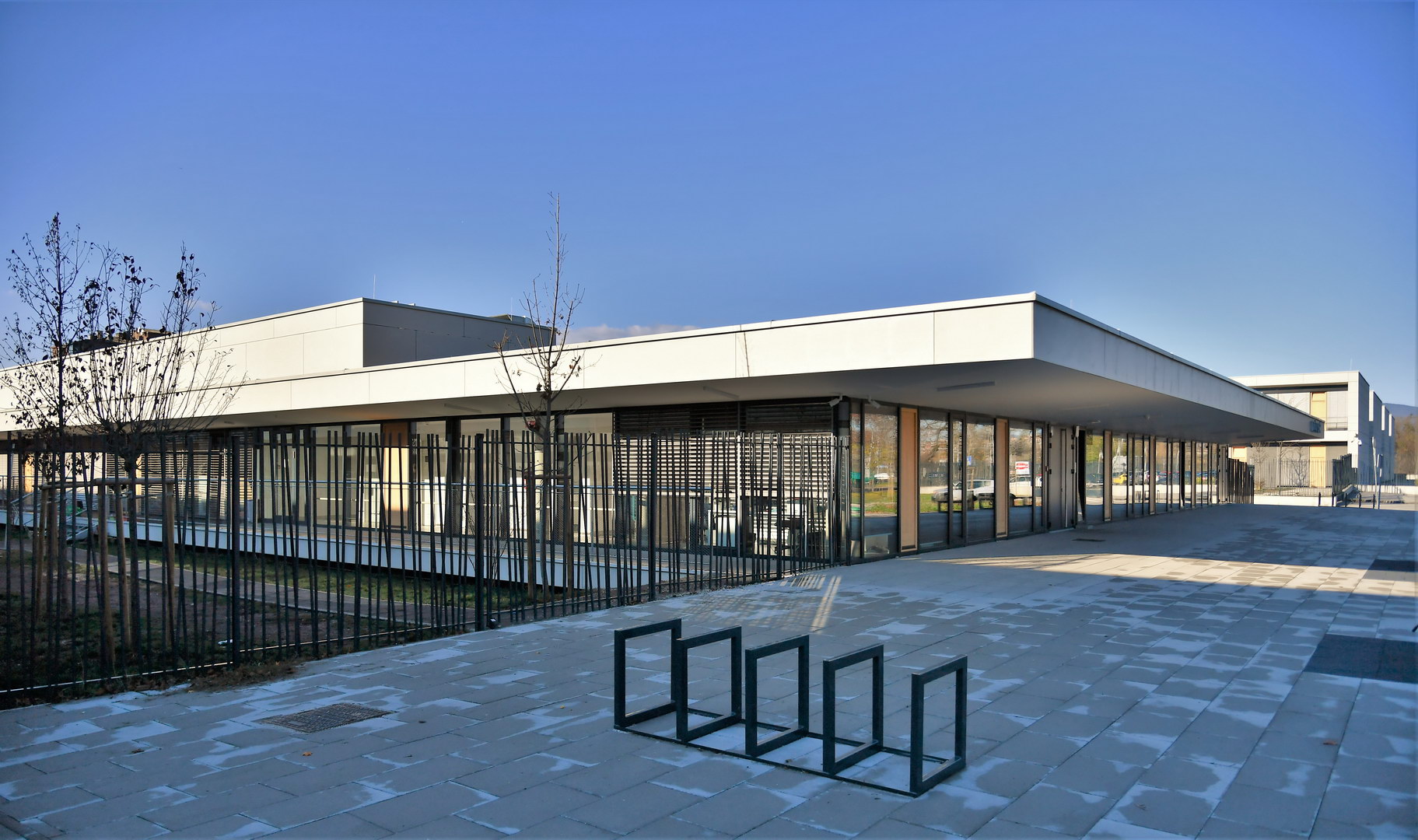 As well as American internatiol school, public elementary school and kindergarden have fibercement facade panels Silbonit, series Hydro, colour Naturale on ventilated facade.