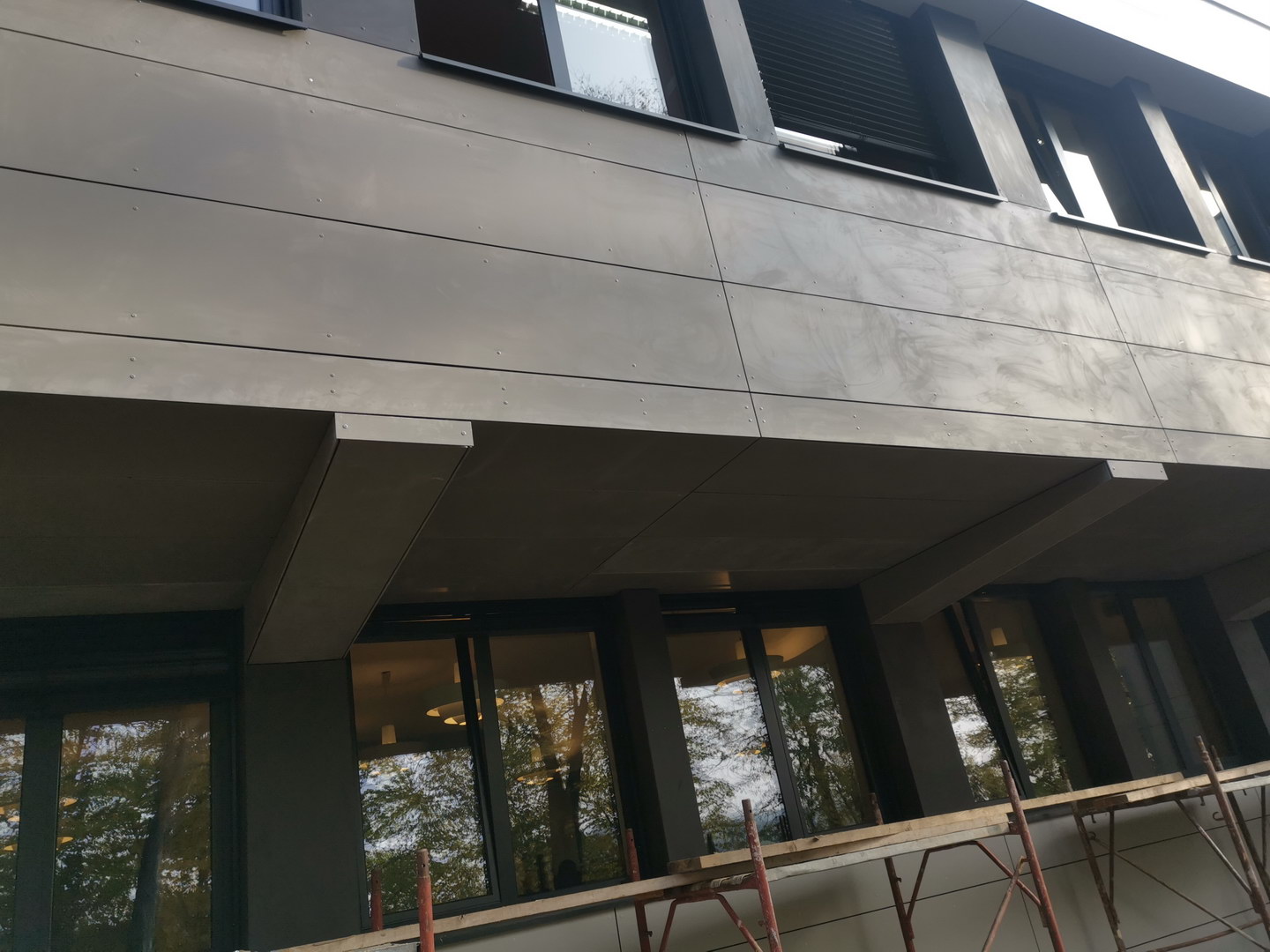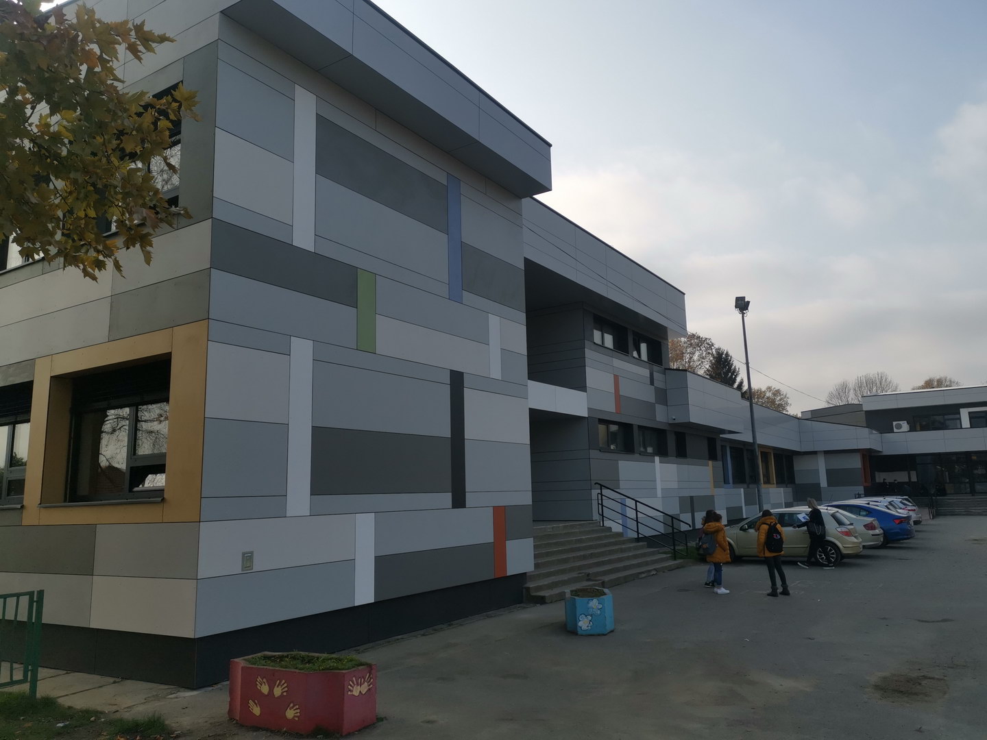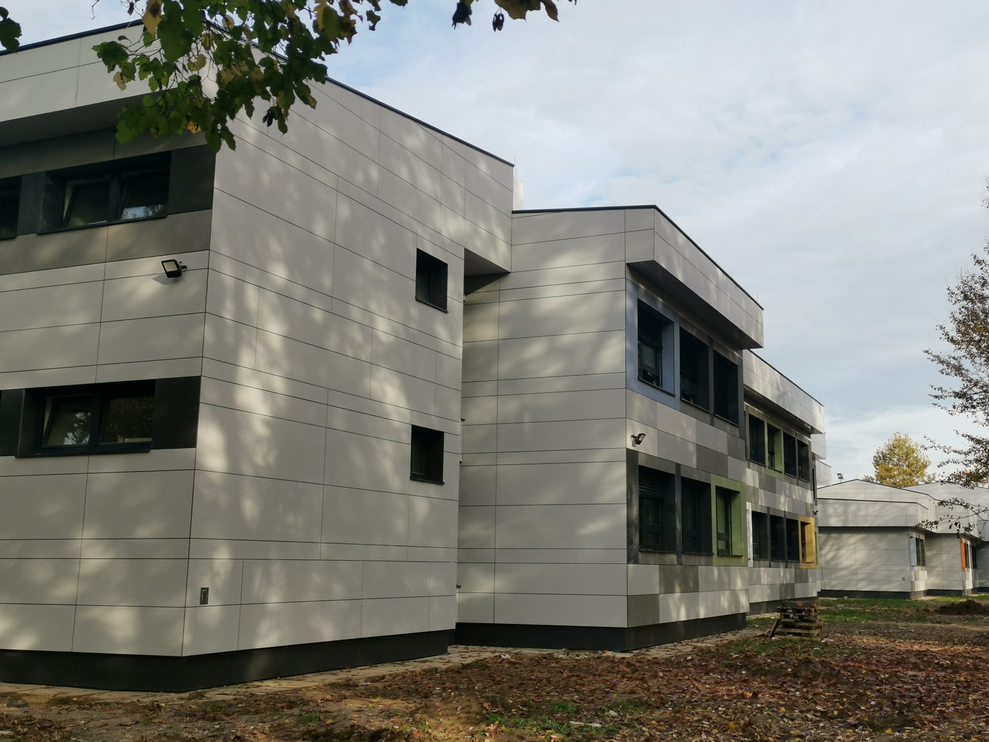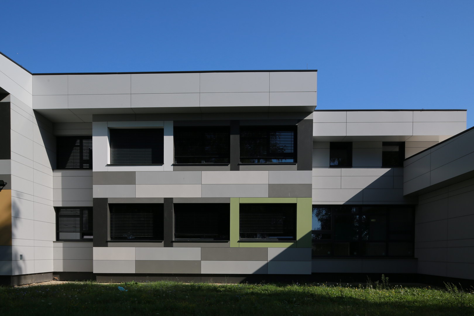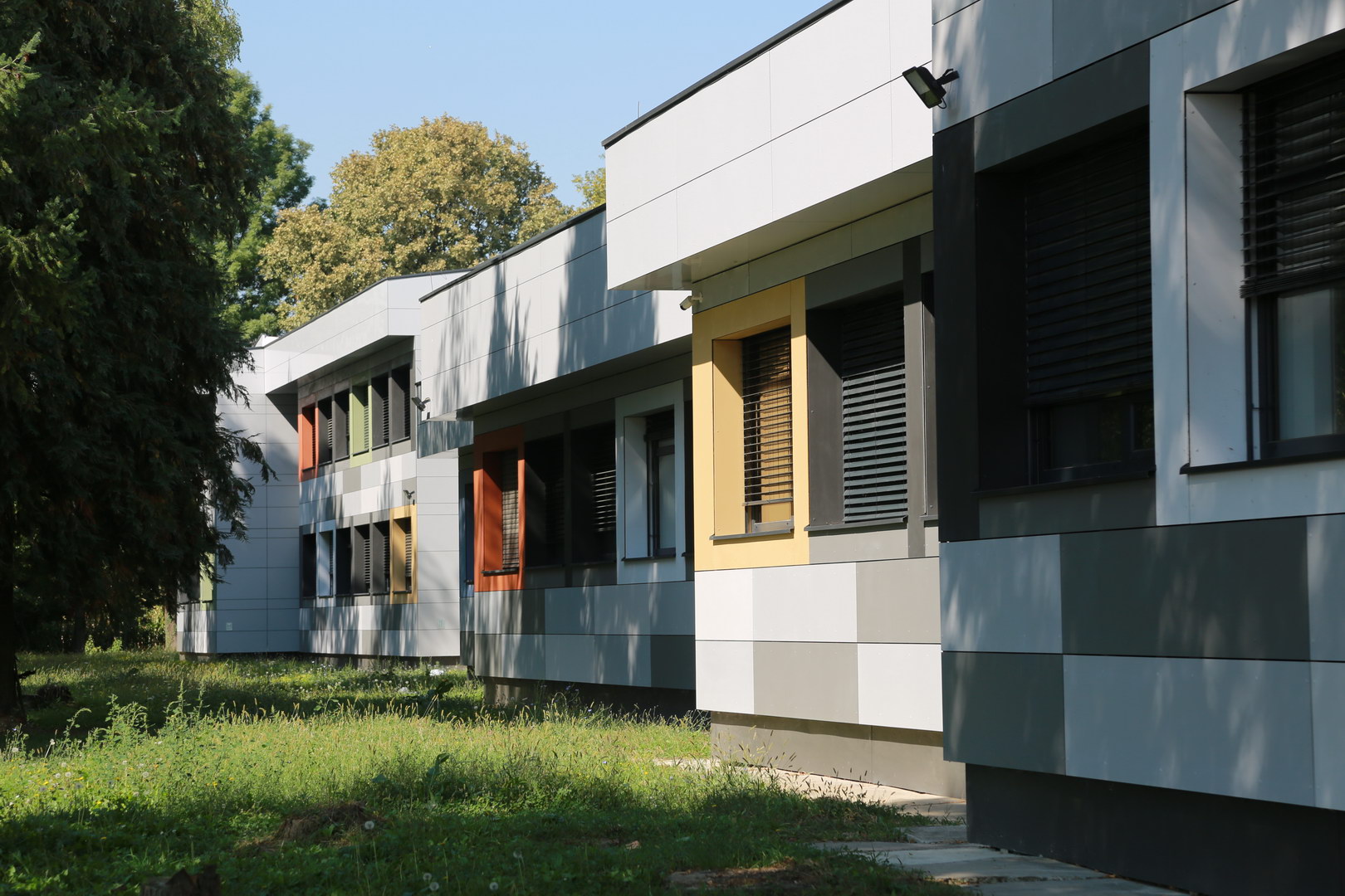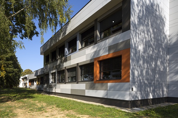 Mosaic of multiple colours on fibercement panels Silbonit, series Pigmenta (antigrafiti) are chosen for ventilated facade cladding.