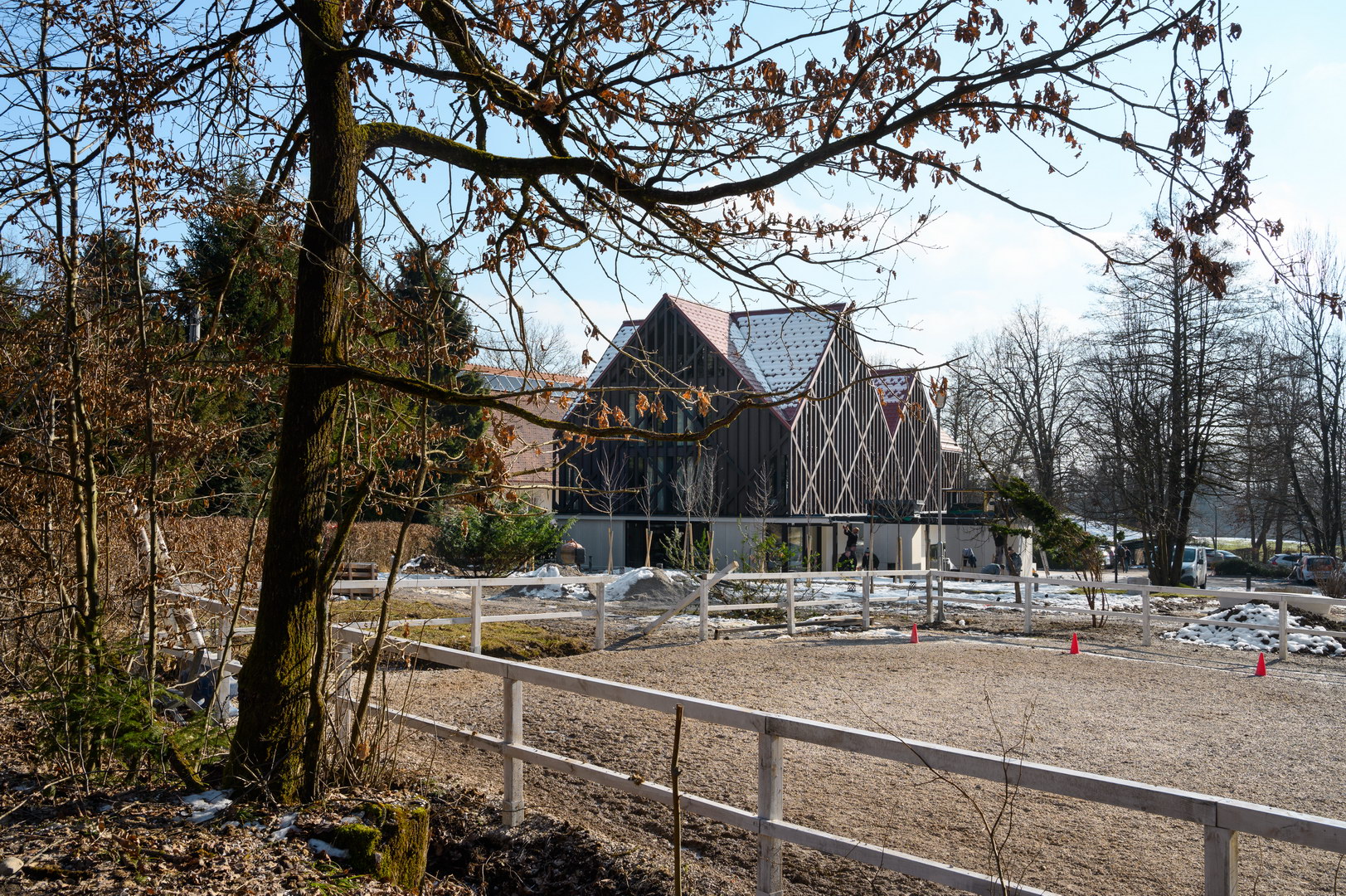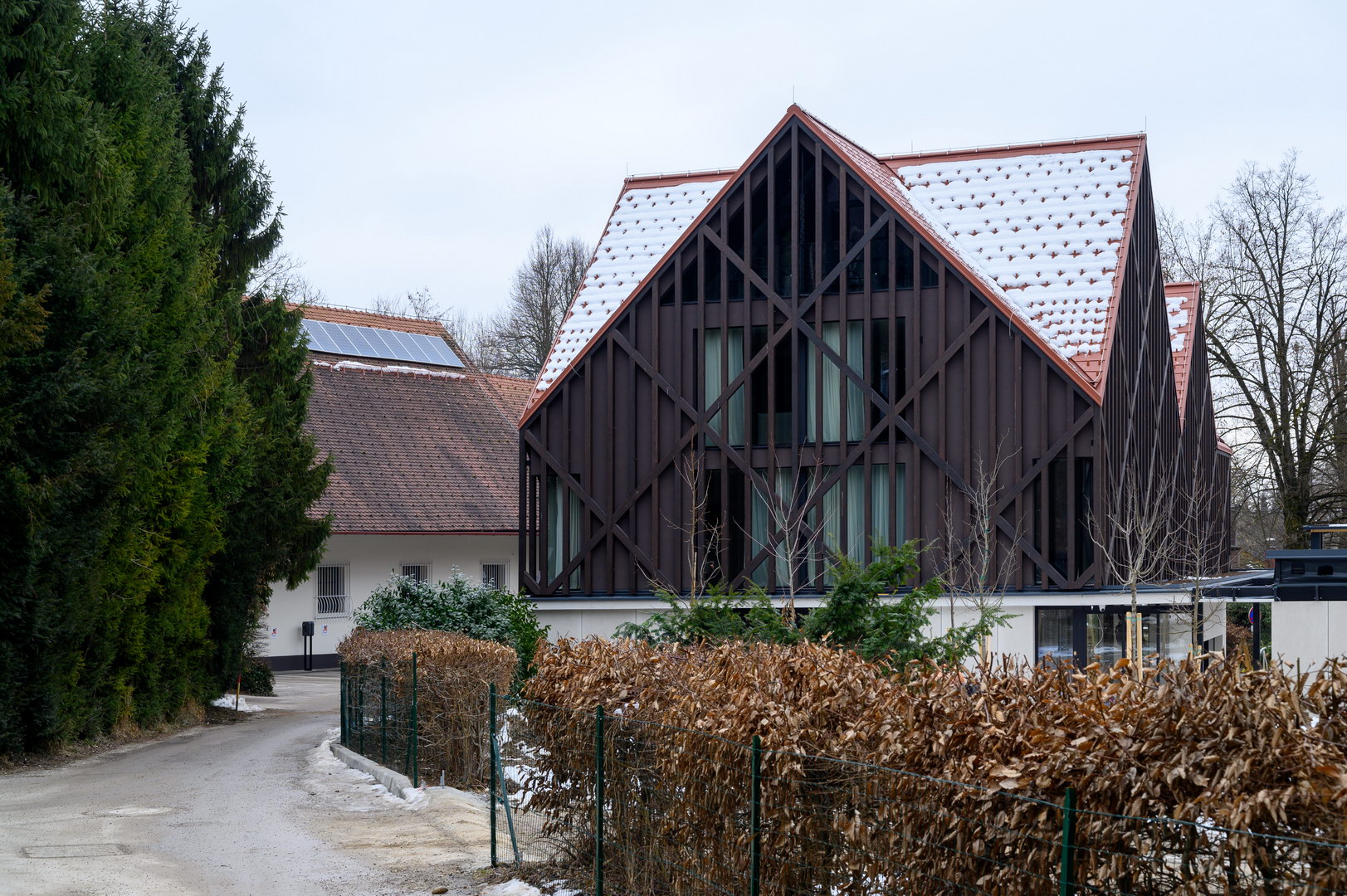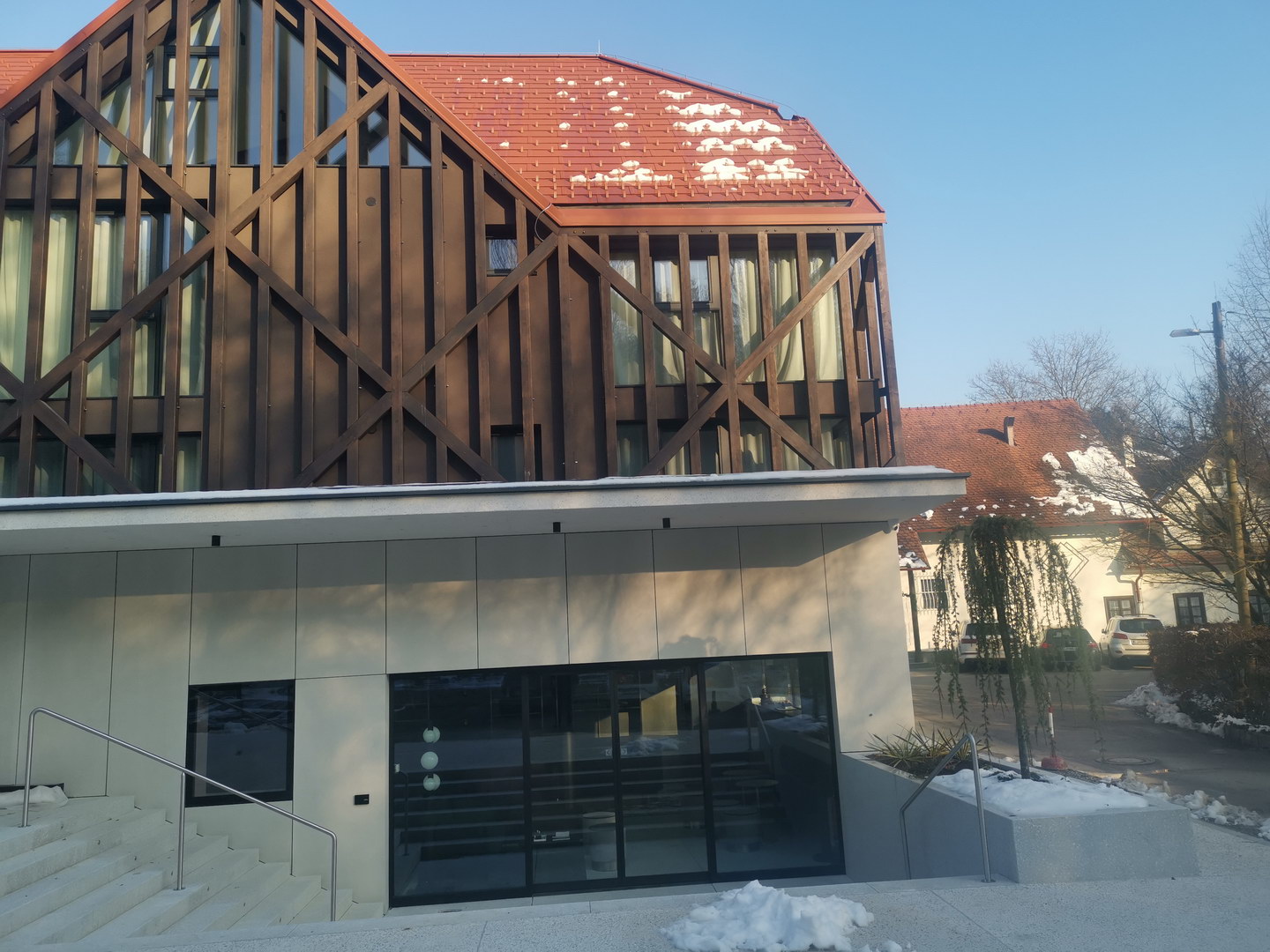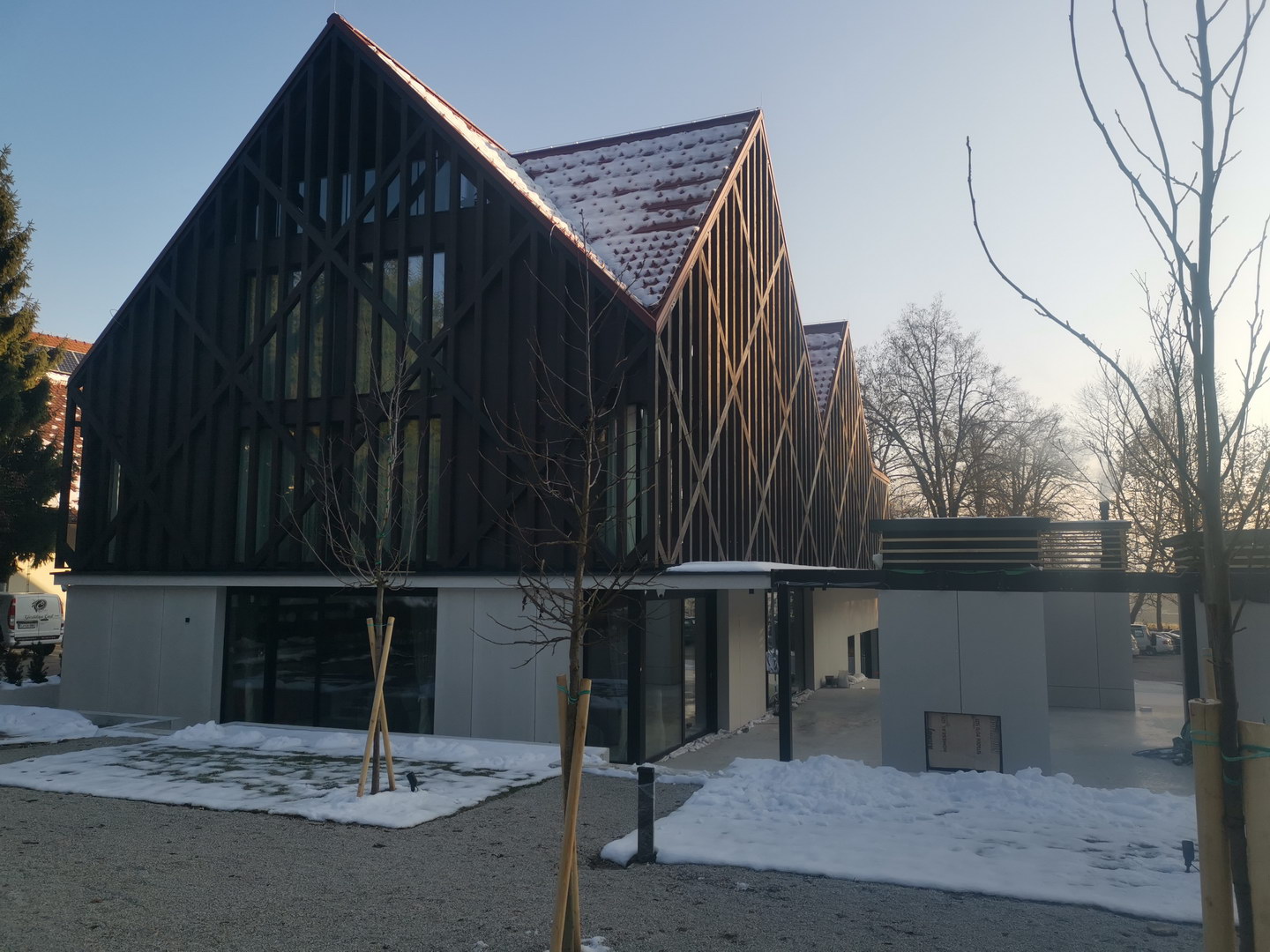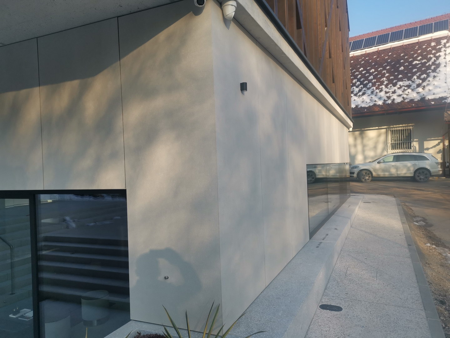 Ventilated facade on graund floor is done with fibercement panels Silbonit, series Surface, colour Naturale, thickness 10 mm.
