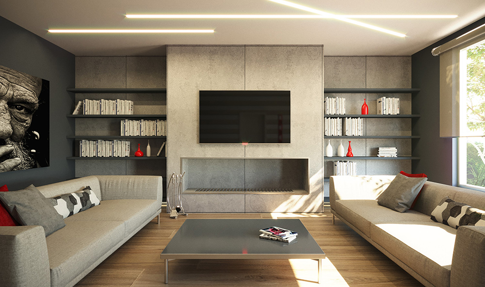 In interier on the photo fibercement panels Silbonit, series Hydro, colours Grigio and Deserto are used.