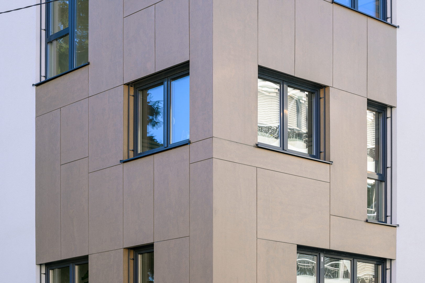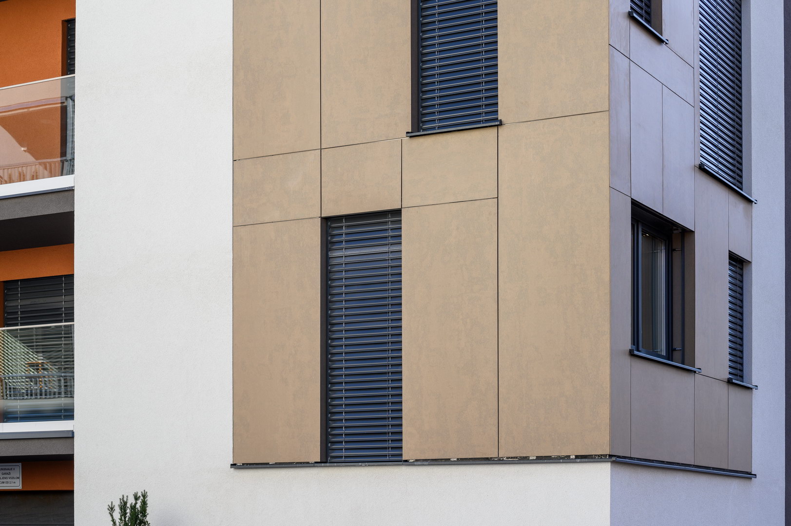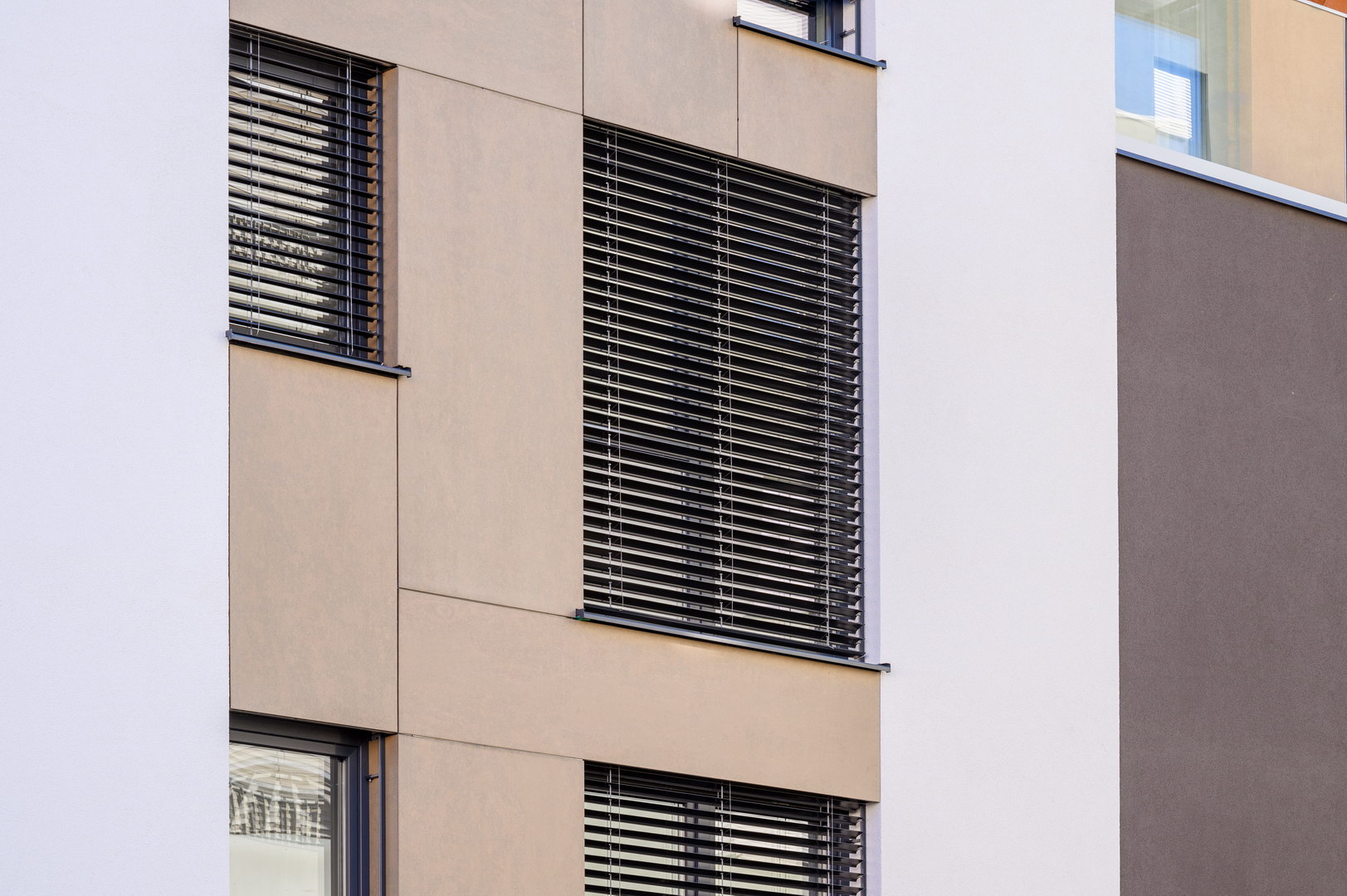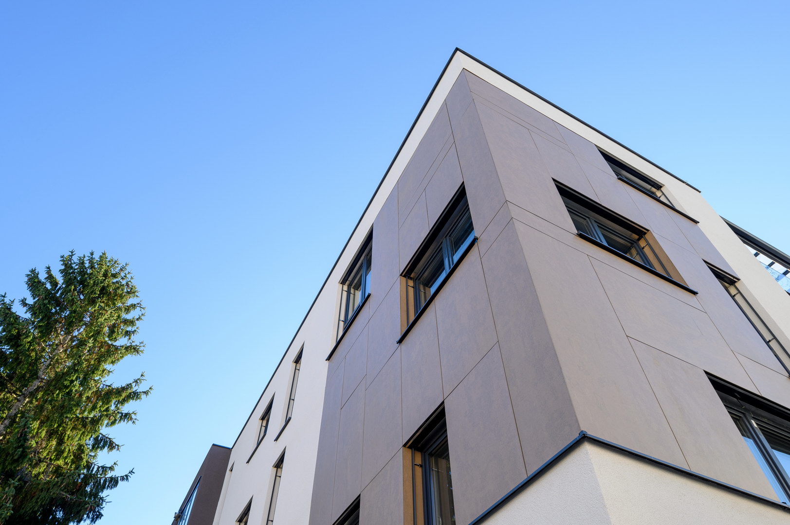 Fibercement panels Silbonit, series Hydro, colour Deserto, are use as cladding of ventilated facade.