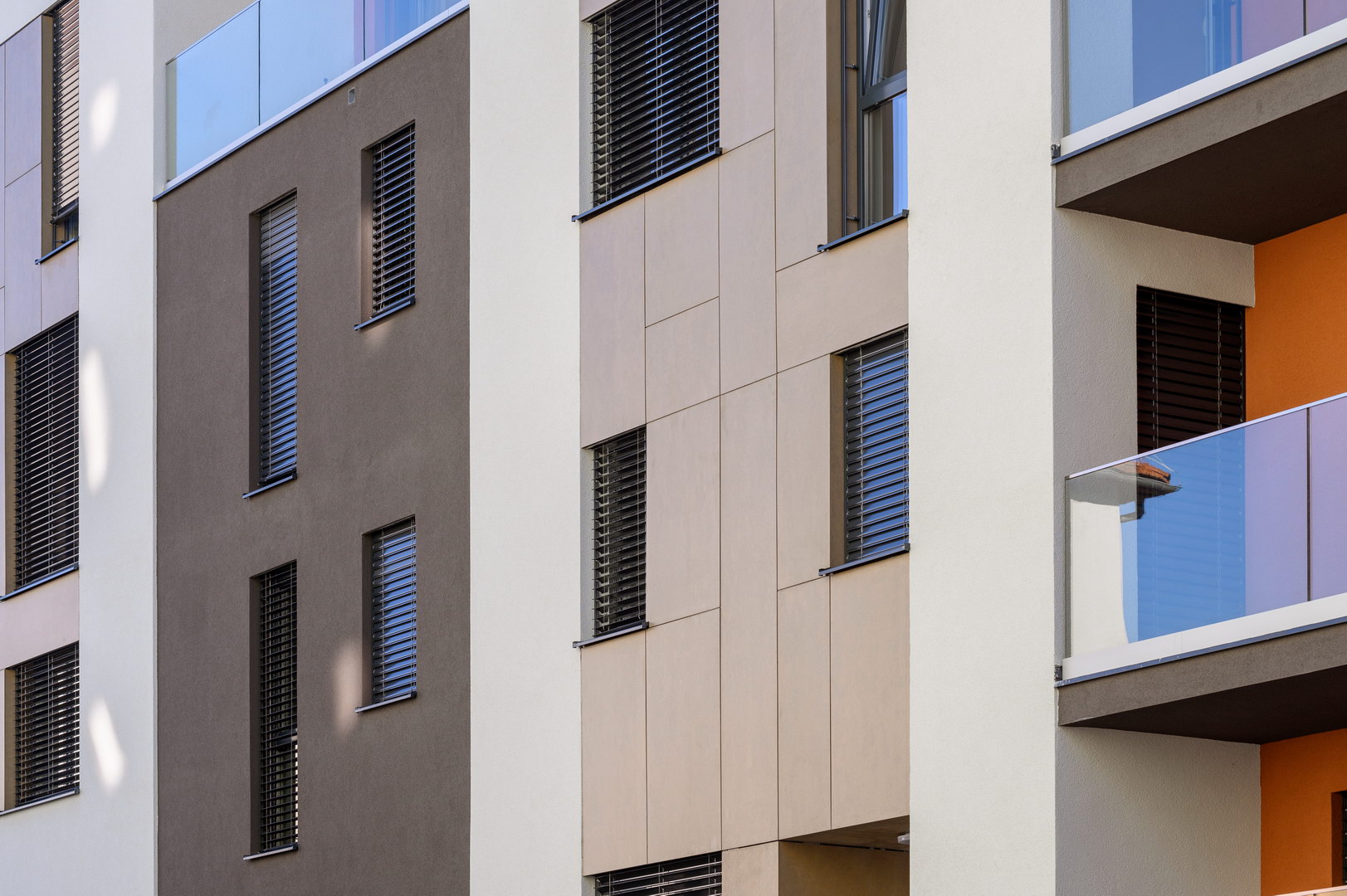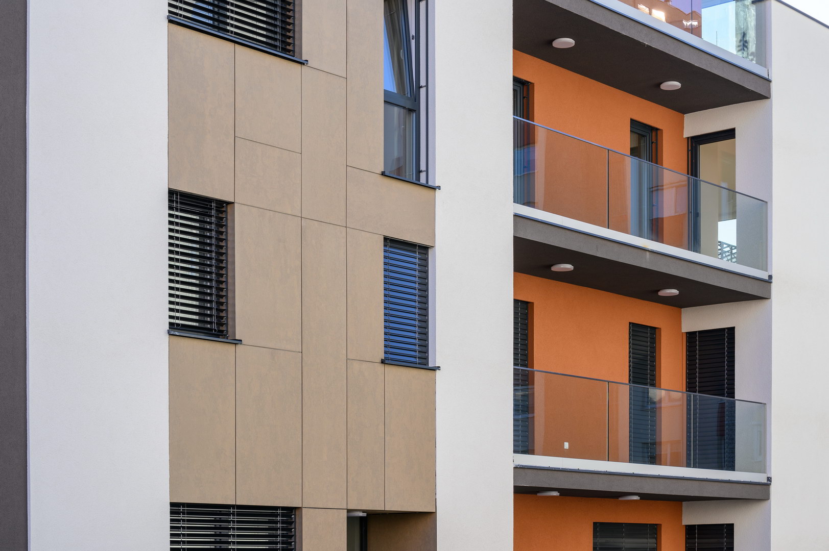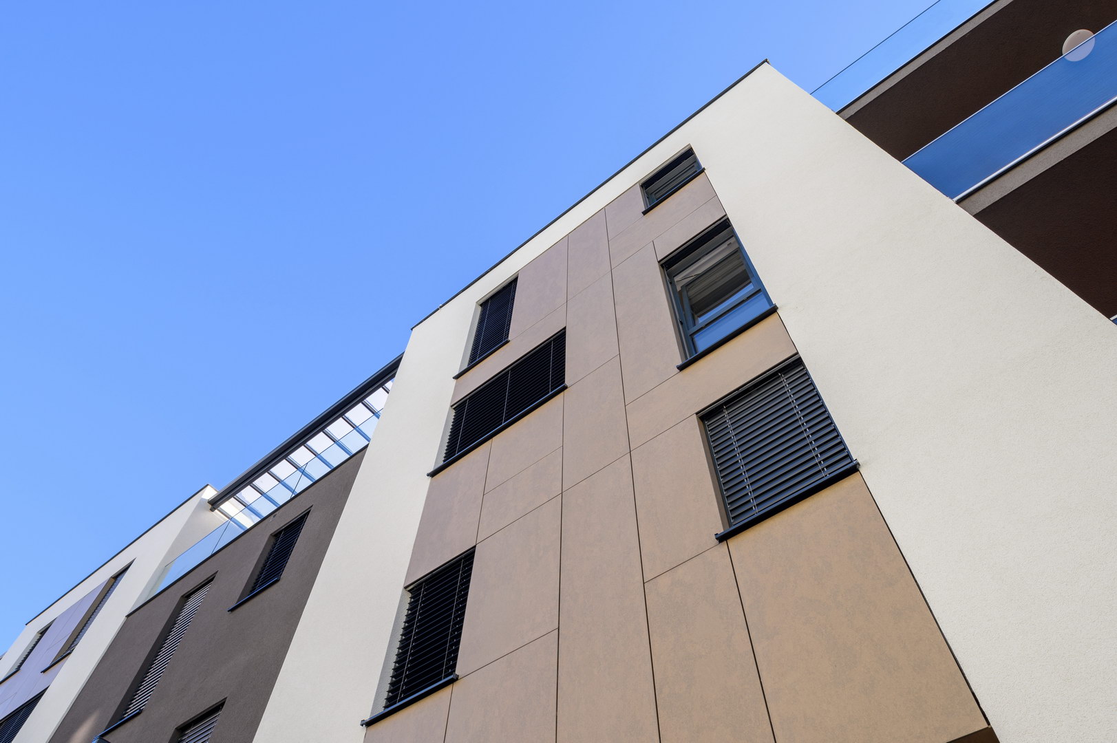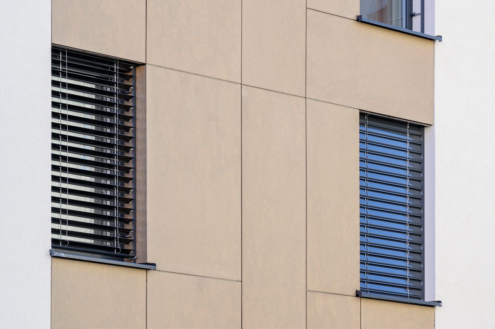 Fibercement panels Silbonit, series Hydro, colour Deserto, are use as cladding of ventilated facade.