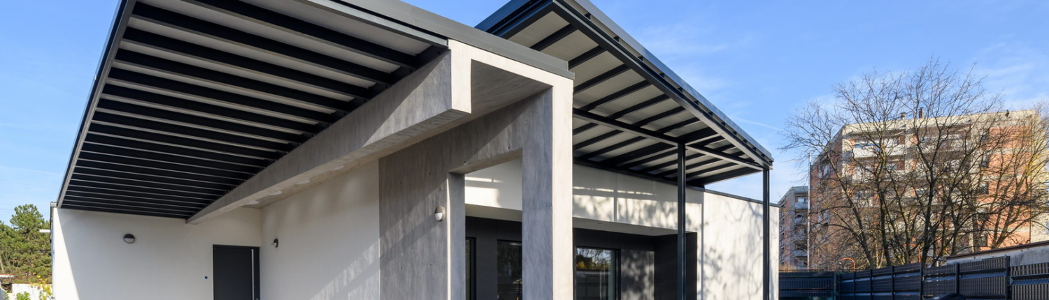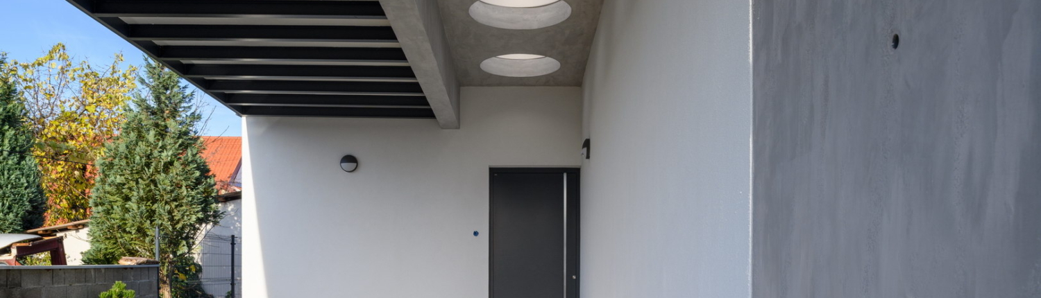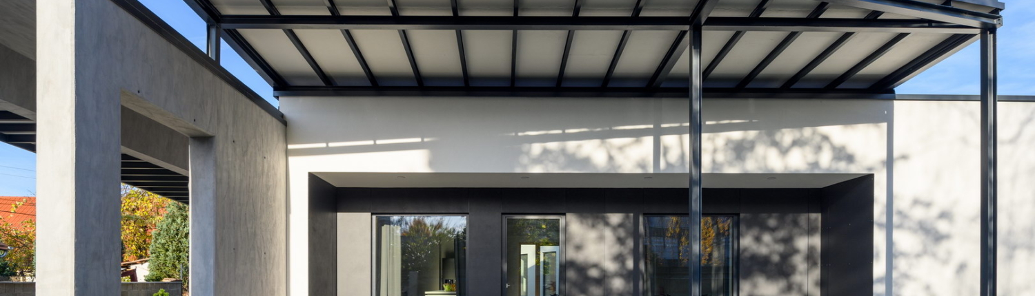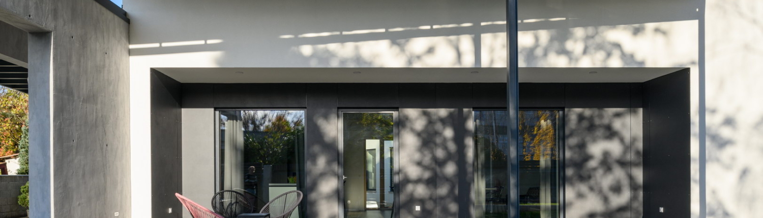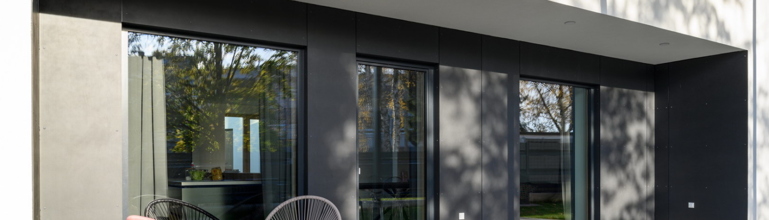 Fibercement facade panels Silbonit, series Hydro, colour Lavagna are used as cladding of alcove on the terrace.