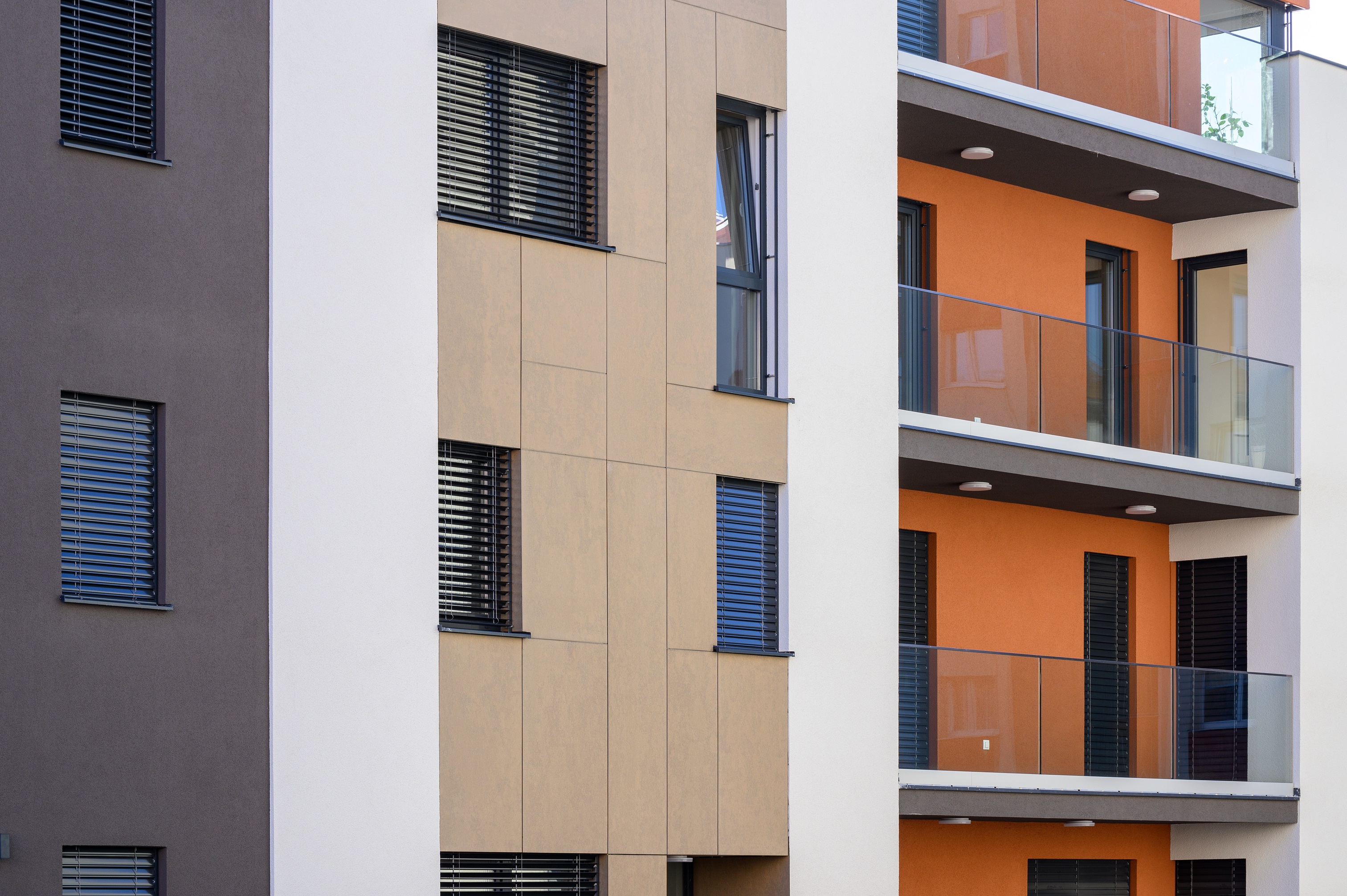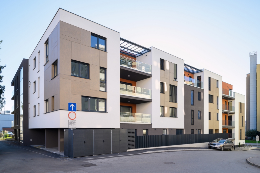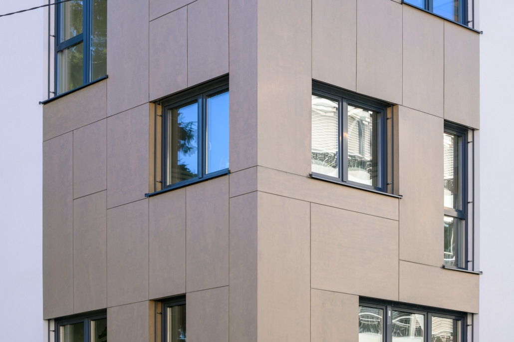 Ventilirana fasada s oblogom od vlakno cementnih ploča u kombinaciji s različitim materijalima stvara kontrastne teksture i odgovarajuće tonove boja. Kombinacija ovih boja pojačala je estetski izgled fasade. Osim estetskih mogućnosti, ventilirani fasadni sustav pruža i značajne uštede energije, štiti zgradu od vanjske vlage, stvarajući zdravije okruženje za stanare. Odabrani završni sloj bili su Hydro paneli, u Deserto tonovima, s modernim, izraženim dizajnom ploča.